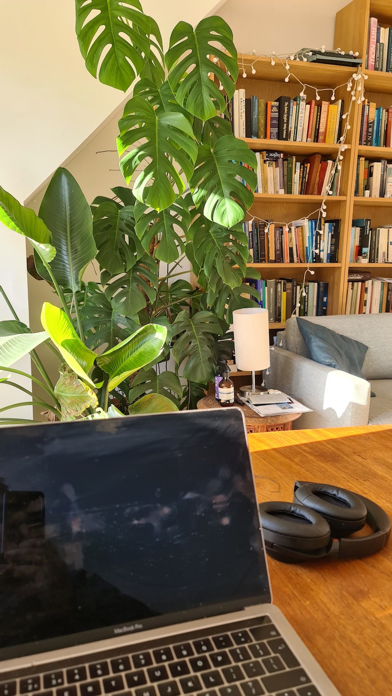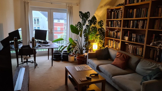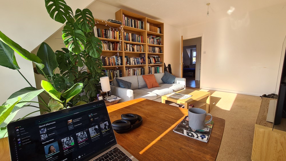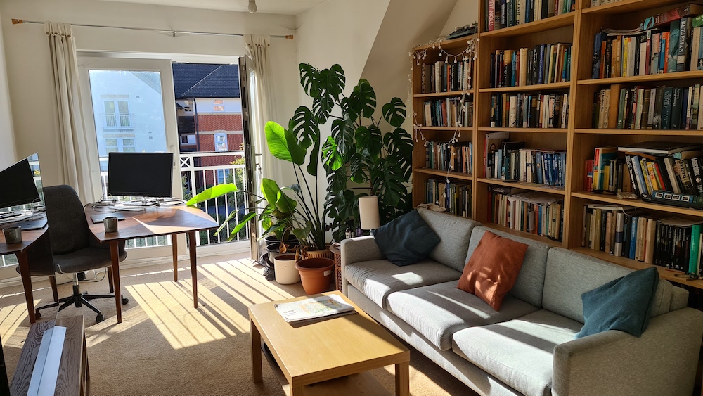 Lounge with lots of natural light through the glass doors of the Juliet balcony. Three-seater sofa, large 4K OLED TV, desk with office chair, bookcases.
