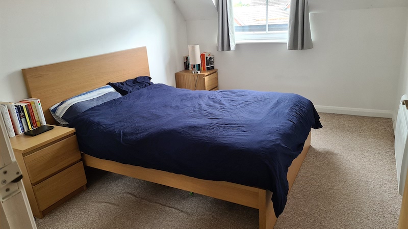 Master bedroom with double bed, wardrobe, and two bedside cabinets.